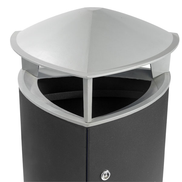 Profesjonalny i solidy śmietnik przemysłowy przeznaczony do wewnątrz jak i na zewnątrz obiektów użyteczności publicznej. W szczególności jako wyposażenie przestrzeni miejskiej. Pozostałe przeznaczenie: biuro, lotnisko, centrum handlowe, hale targowe, biurowce etc. Pojemnik ze stalową powłoką ze stali nierdzewnej, obręcze z aluminium, odlewane ciśnieniowo. Betonowa podstawa.